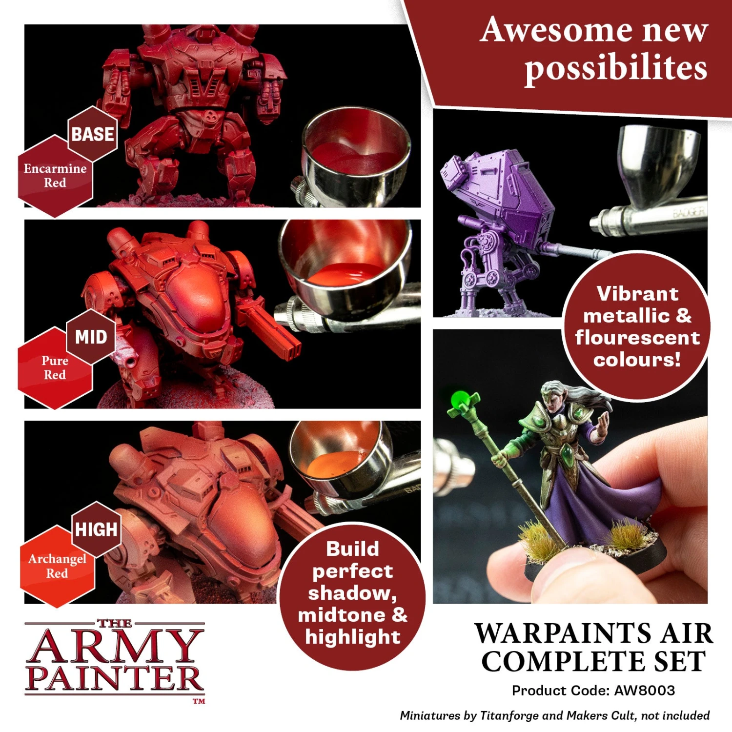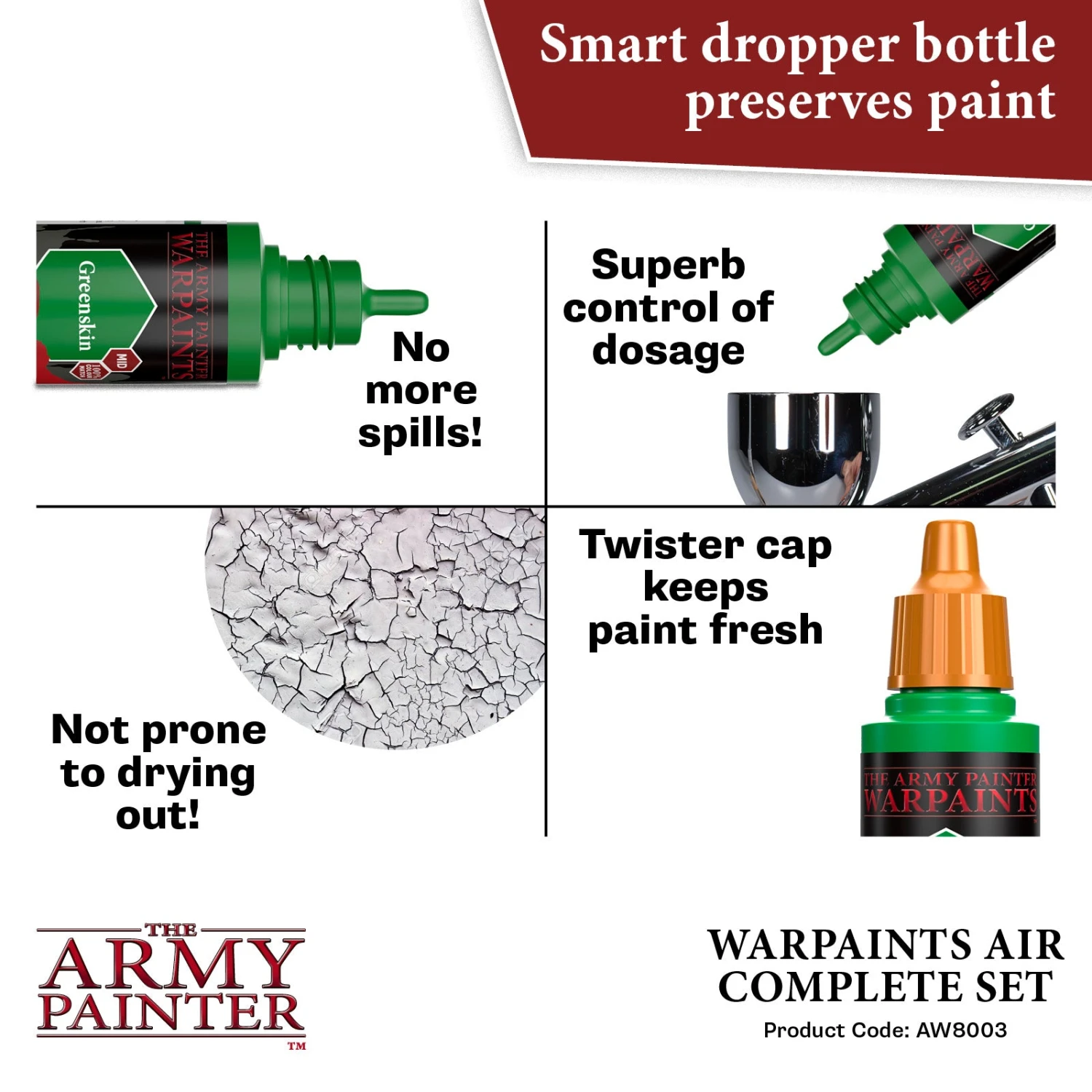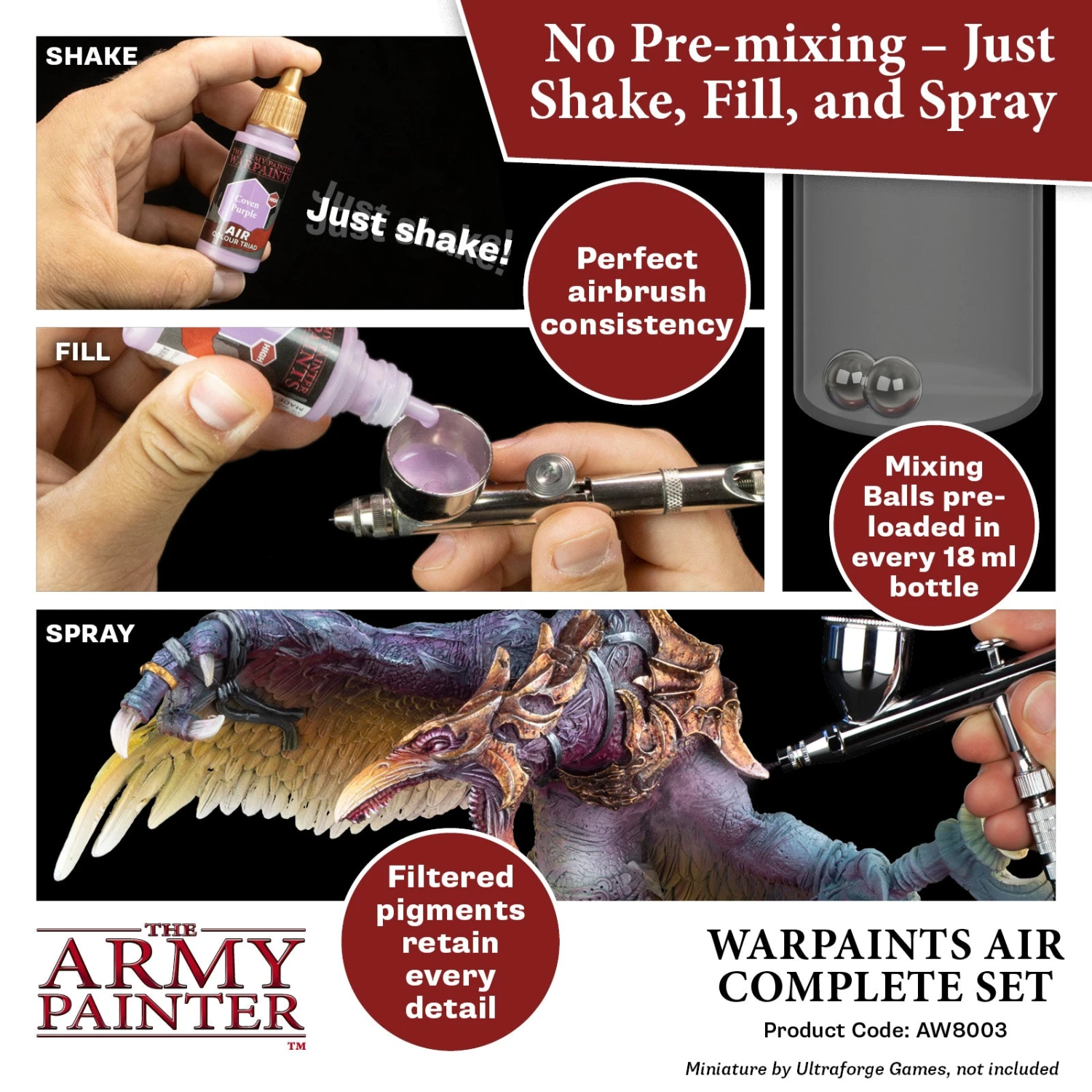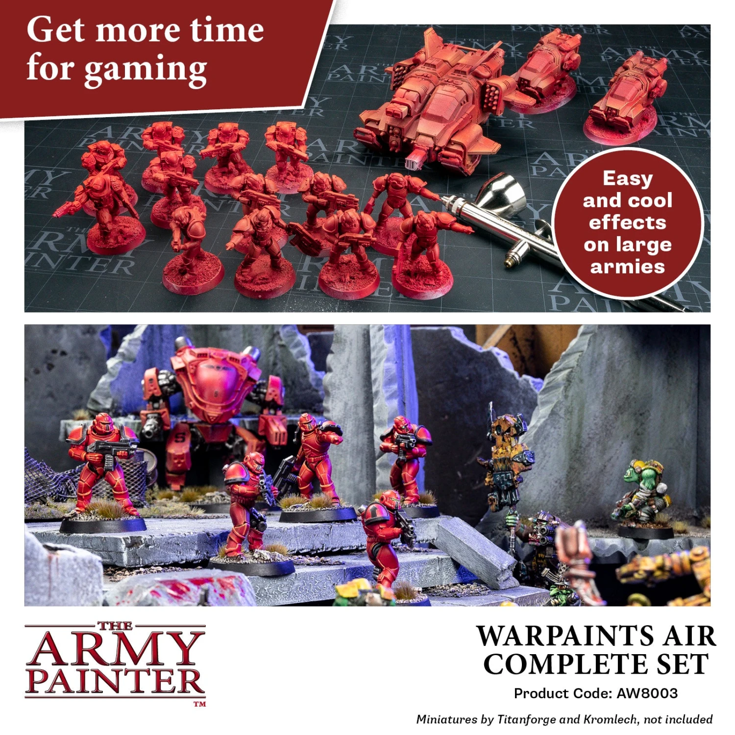 The Warpaints Air Complete Paint Set includes all 126 colors from The Army Painter airbrush range. Inside you will find virtually every color you will ever need to airbrush any miniature or army—no matter the size or genre. You’ll get a diverse palette ranging from crisp acrylics and shimmering metallics to vibrant fluo paints. The Warpaints Air paints feature ultrafiltered pigments and are pre-thinned, making them ready-to-use right out of the bottle.