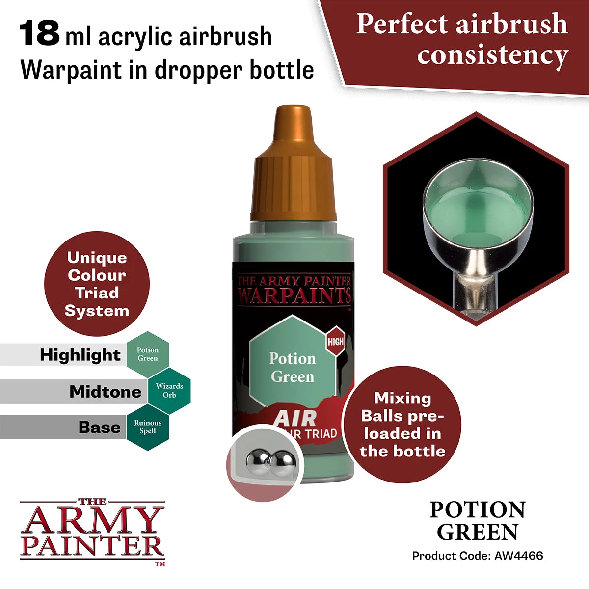 All Warpaints Air are pre-mixed and airbrush-ready right out of the bottle and made from ultra-filtered vibrant pigment. The Warpaints Air range has been developed in a unique and innovative Triad System—each matching Warpaints Acrylics color has a corresponding Base and Highlight color. This makes highlighting and zenithal shading a breeze and army painting even faster and more cohesive. To make things easier Warpaints Air comes pre-loaded with two steel Mixing Balls.